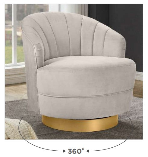 This swivel accent chair upholstered in soft velvet fabric, plush cushioned seat & curve tub style provides excellent support and relaxation featuring a subtle shell stitching and channelled details available in Beige or Rust to suit in a living room, bedroom, or your office.