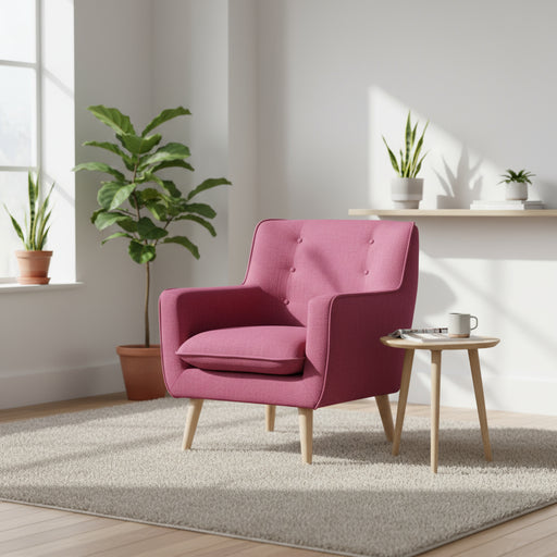 Description Colour: Magenta Include: 1 x Accent Chair Upholstery: Tufted Magenta Linen fabric Frame: Timber, foam, spring Legs: Solid Wood natural...