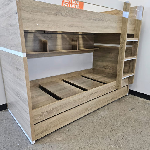 View full detailsOak Mabell Single over Single Convertible Bunk Bed with Shelves & Trundle