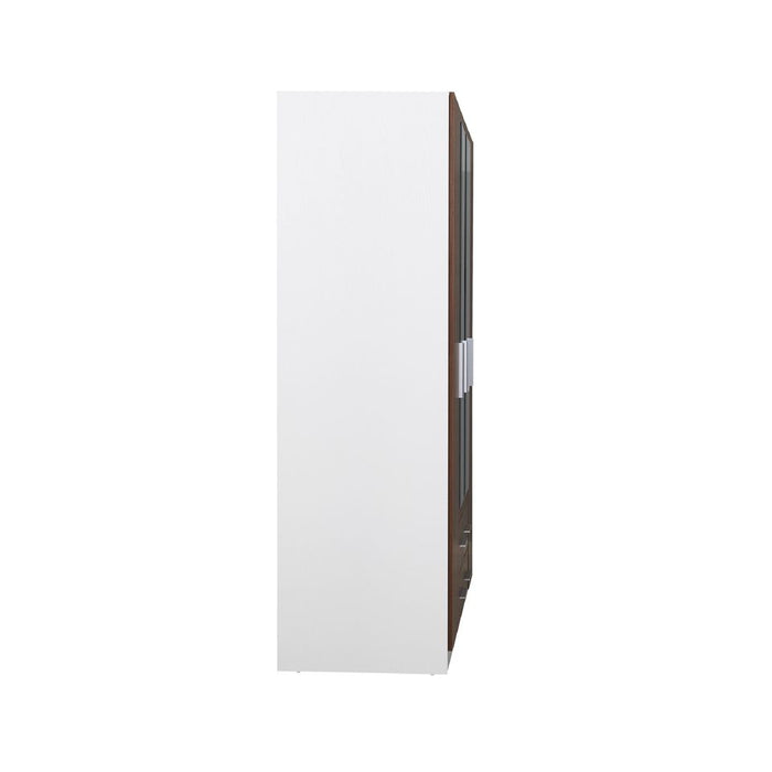 Perfect for those who love a touch of luxury in their home. Not only does it provide ample storage space with four drawers and two mirrored doors, but it's also built to last for years to come and designed to meet your every need. With shelving on both sides and a hanging space in the middle, it's the perfect solution for organizing your wardrobe while adding a touch of elegance. Its stunning combination of white and walnut colors will complement any decor and elevate the style of your room.