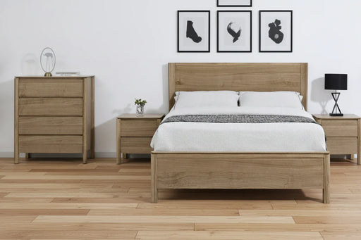 Specifications Includes: 1 x Queen Bed, 2 x Bedside, 1 x Tallboy Style: Modern Colour: Oak Material: Timber, MDF, Metal Side Gas Lift, Front Draw...