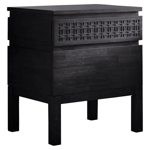 Features Catch your eye with this beautiful detailed bedside. Made from mango wood with mixed teak wood construction. Inlaid pattern in mat bla...