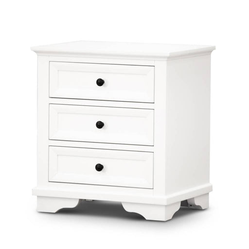 Product Descriptions Colour: White Material: Solid Acacia Timber 3 Drawer storage with full extension runners Black metal knobs Fully Assembled ...