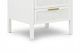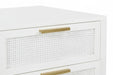 - Accented with a chic gold drawer pull and charming rattan woven insert on the front.