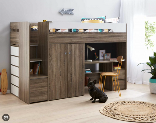 The Quantum King Single Bunk Bed Loft in Mocha Oak is a space-saving all-in-one unit featuring a bed, wardrobe, and desk. Built with a solid engine...