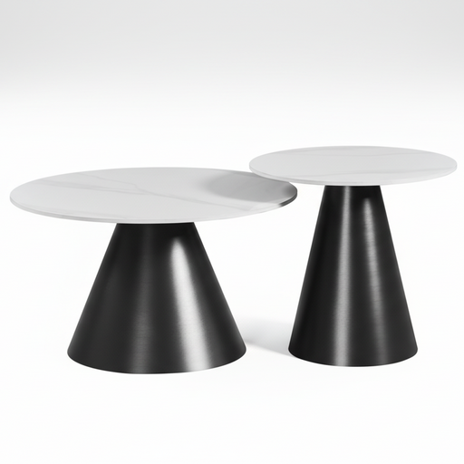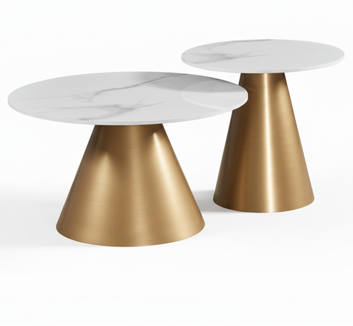 A sophisticated two-piece coffee table collection featuring contemporary sintered stone surfaces paired with warm steel frames accented in gold or ...