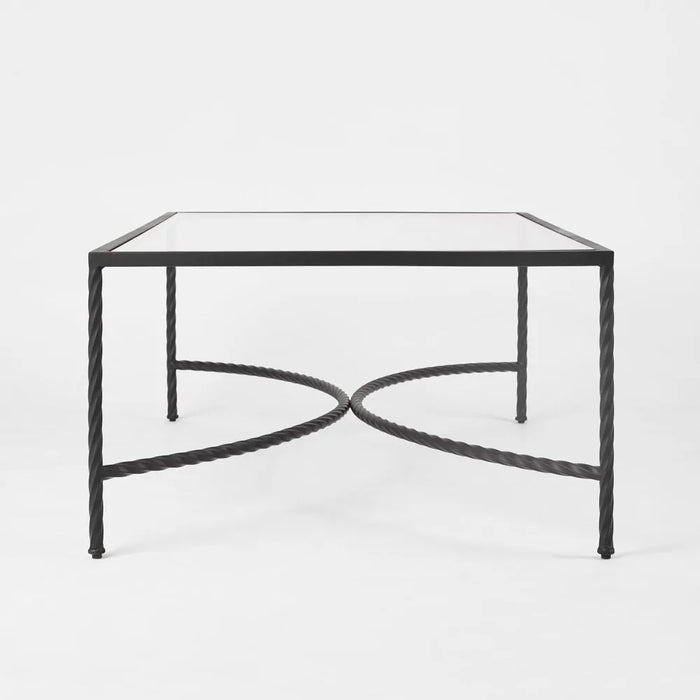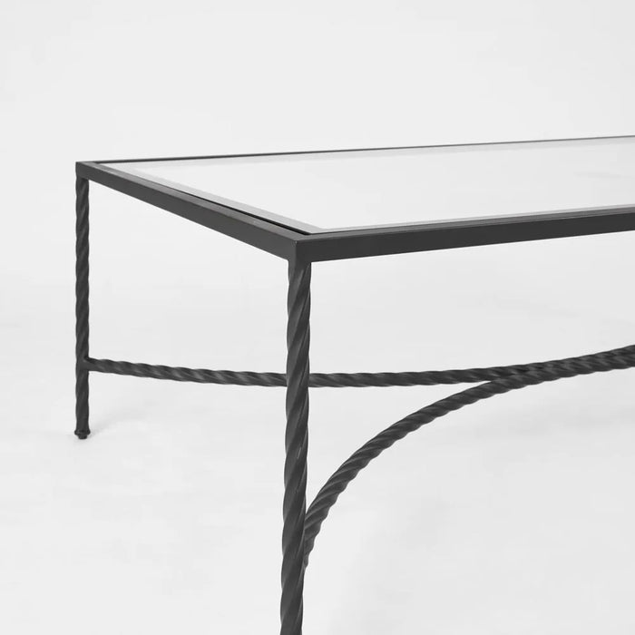 - Bevelled glass table top sits flushed within the frame