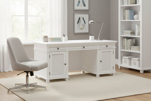 Description West Beach Hampton Office Desk in White Double Leg features three drawers and dual louvered cupboards for comprehensive storage. The st...