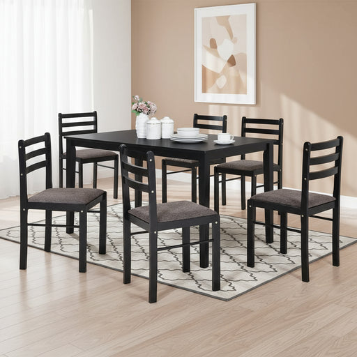 In stock Features Includes: 1 x Table and 6 Chairs Seating Capacity: 6 person Compact size Colour: Cappuccino Material: MDF Timber and Okoume P...