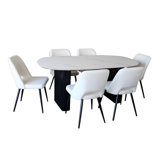 ONLINE ONLY / Was $1,999 / Save $400 (20%) Features Includes 1 x dining table and 6 boucle upholstered chairs White marble-look tab...
