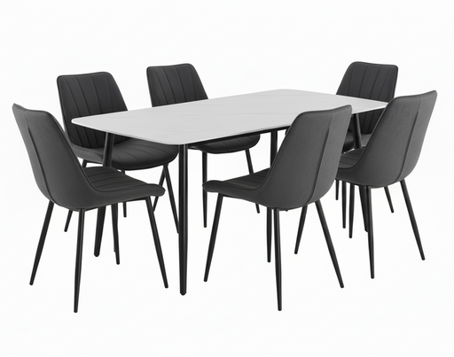 ONLINE ONLY Was $1,999 / Save $400 (20%) Features Includes 1 x dining table and 6 Polyester upholstered chairs White marble-look tab...