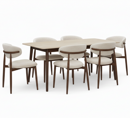 About this Dining Set Crafted from premium rubber wood with an authentic natural timber finish, this six-seater dining ensemble combines Scandinavi...