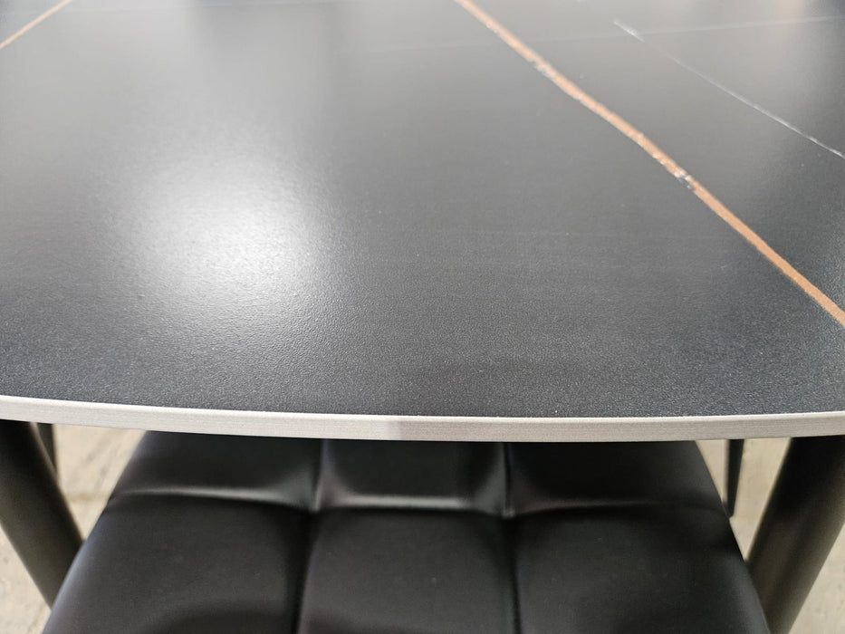The Fiore Dining Table features a durable, easy-to-clean panel made of sintered stone. This specialized material offers heat and fire resistance while also protecting against burns, stains, and scratches. A reliable option for long-term use..