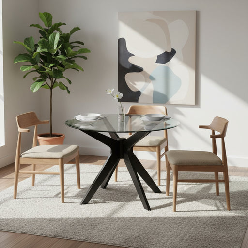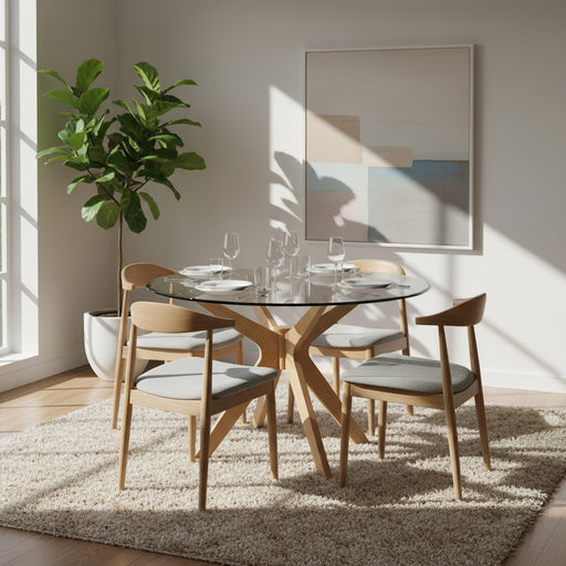 Specifications Seating Capacity 4 Person Shape: Round Table Top: Tempered Clear Glass Frame: Solid Acacia Wood, Natural Assembly Require: Yes Dim...