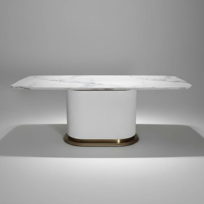 This dining set is designed with elegance and glamour in mind, featuring a stunning marble table and stylishly coordinated chairs. Crafted with the finest materials, this set is sure to elevate any dining experience.Your guests will be impressed by the elegant design and high-quality materials.