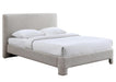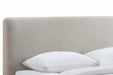 - Soft and serene bedframe featuring a generously padded headboard with rounded corners, low footend with matching upholstered legs