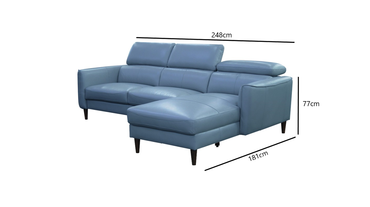Contemporary look slimline arms featuring a sleek, modern design and a slim profile, the Mahira Leather Sofa with Chaise Blue is the perfect addition to any contemporary living space. With its slimline arms, this sofa offers a sophisticated and understated style that will elevate the look of any room.