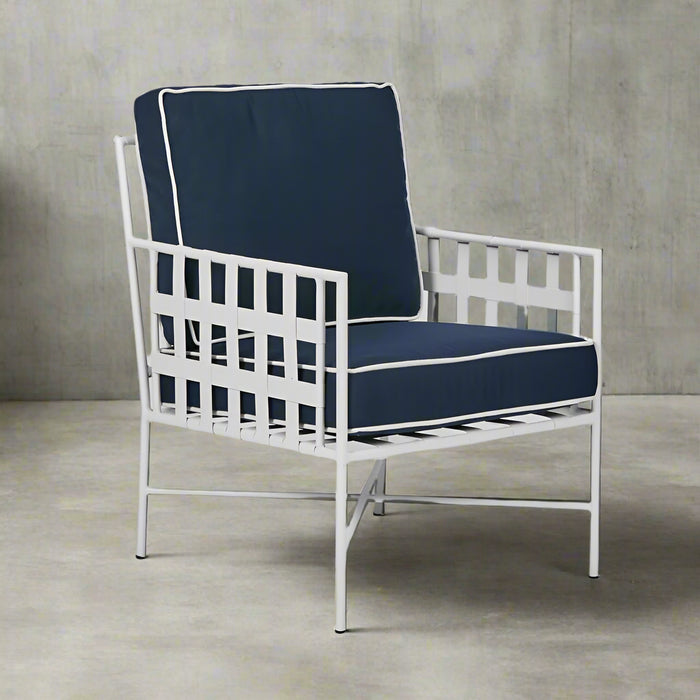 The Sheffield Iron Outdoor Lounge range in Navy is a stylish and durable piece designed for both outdoor and under-cover use. It features a striking navy color with contrast white piping, adding a touch of elegance to its robust iron construction. This lounge chair combines comfort and aesthetic appeal, making it a versatile addition to any outdoor living space. Cushions should not be left outside for extended periods or in the rain. Furniture left on damp ground or in pooled water will reduce the life of the frame.