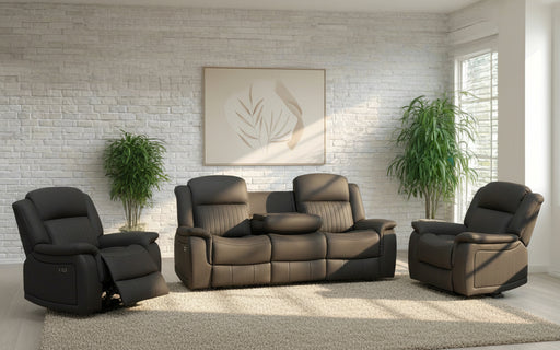 Product Features Includes 3 Seater recliner, 2 x armchair recliner Power electric recliner action with USB phone charger. Upholstery: Murano Leat...