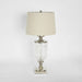 A elegant lamp and the right atmospheric lighting has the power to totally transform a space. This regal design is comprised of a trophy-shaped base made from glass and iron, completed with a natural linen drum shade. For perfect symmetry, style in a pair.