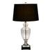 • This lamp is a classy addition to your space. The clear glass base is accented with nickel for a glamorous look. Then, the design is completed with a smart black linen shade for just the right amount of drama.