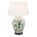 Our Saigon is charming oriental ceramic base table lamp that sits on brown timber base and has classic ginger jar style. The lamp is delicately hand painted with parrot and leaf motif on ivory white background. This is elegant lighting for traditional interiors with green and white colour and perfect to sit on console table in living or family room. The Raffle Hotel in Singapore is the inspiration for the