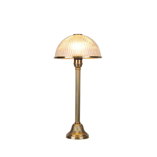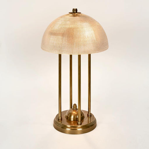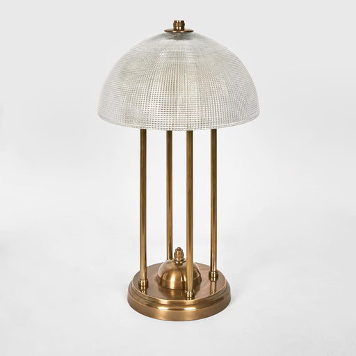 Bejewel your space with our Victor Table Lamp. Its textured dome glass casts a mesmerizing light, while four slender columns in antique brass elega...