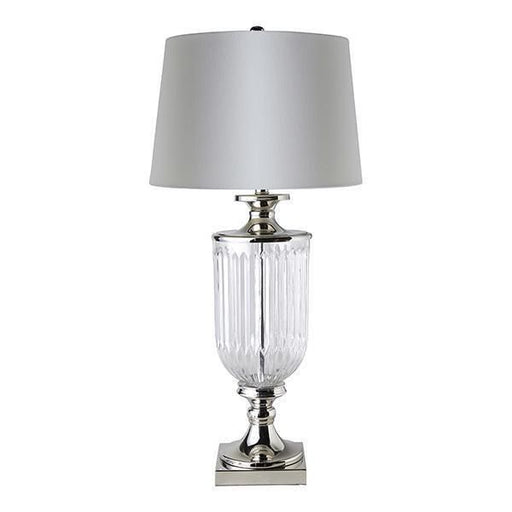 This lamp is a classy addition to your space. The clear glass base is accented with nickel for a glamorous look. Then, the design is completed with...