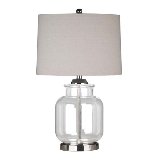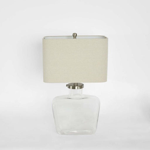 View full detailsCharlotte Glass and Nickel Lamp with White Linen Shade (Black Trim)