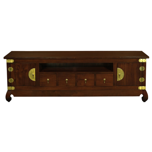 Features Features 2 x doors and 4 x drawers Solid mahogany wood body and frame Additional 1 x holes for easy cable management Brass trims and ha...
