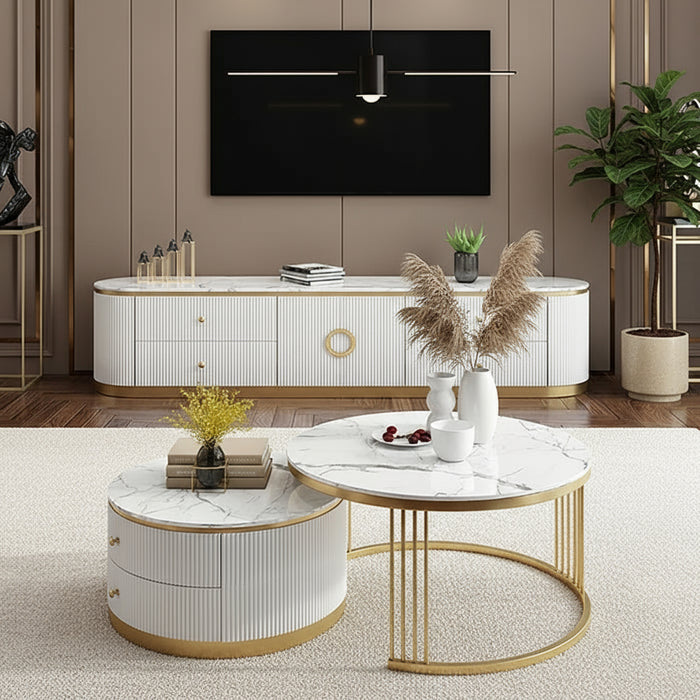 This TV stand offers a modern design with four drawers and enough room to accommodate an 80 inch TV. Complementing product is available like coffee table, nesting table, buffet and dining set to complete the look, its a perfect blend of practicality and elegance for an exceptional combination to your living room.