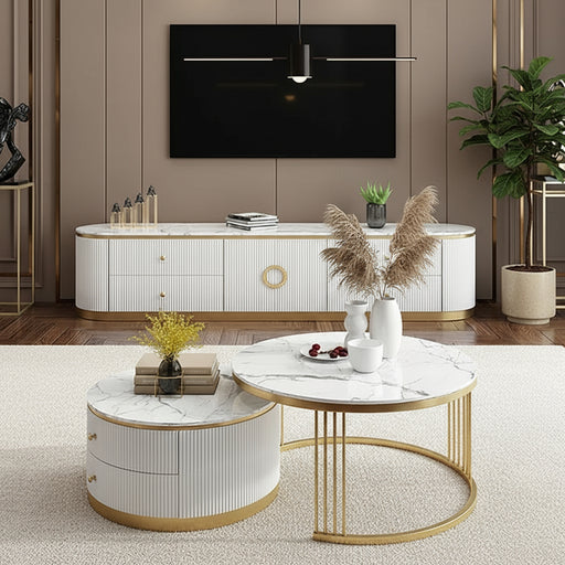 Contemporary Elegance Transform your living room into a modern and elegant space with the Amara TV Stand. Featuring four drawers and ample space fo...