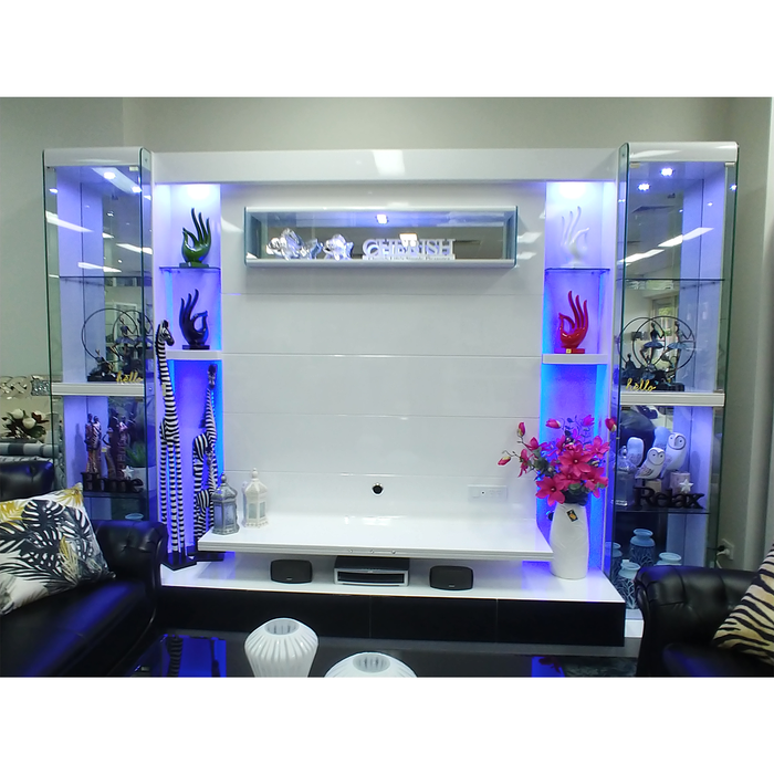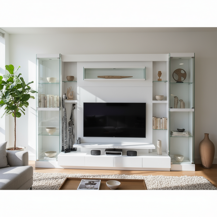 - Four drawers open on smooth metal runners, offering tidy storage for entertainment essentials.