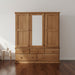 Crafted from solid radiata pine with a stained finish, this substantial 182cm wardrobe combines practical storage with refined design. Two door sections flank a central hanging rail, while five generously proportioned drawers provide dedicated space for folded garments. Adjustable shelving behind the mirror offers flexible organisation for accessories and smaller items, making this piece an intelligent choice for comprehensive bedroom storage.