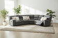 • Generous corner lounge with three recliners in luxe rhino fabric, with visible stitching and soft curves for a modern tailored look